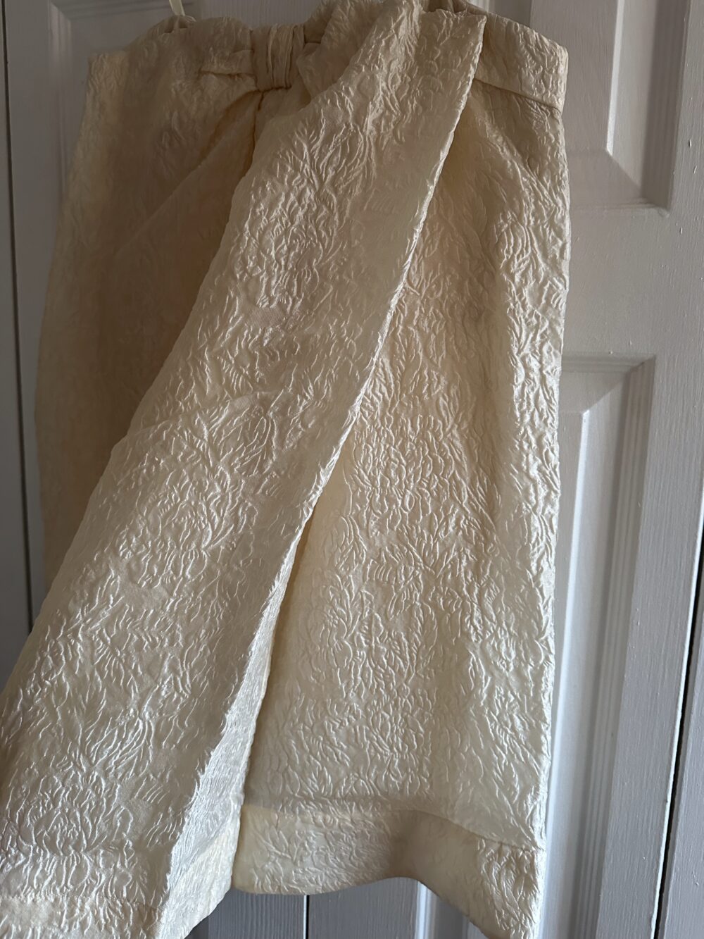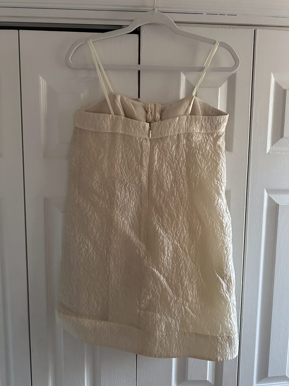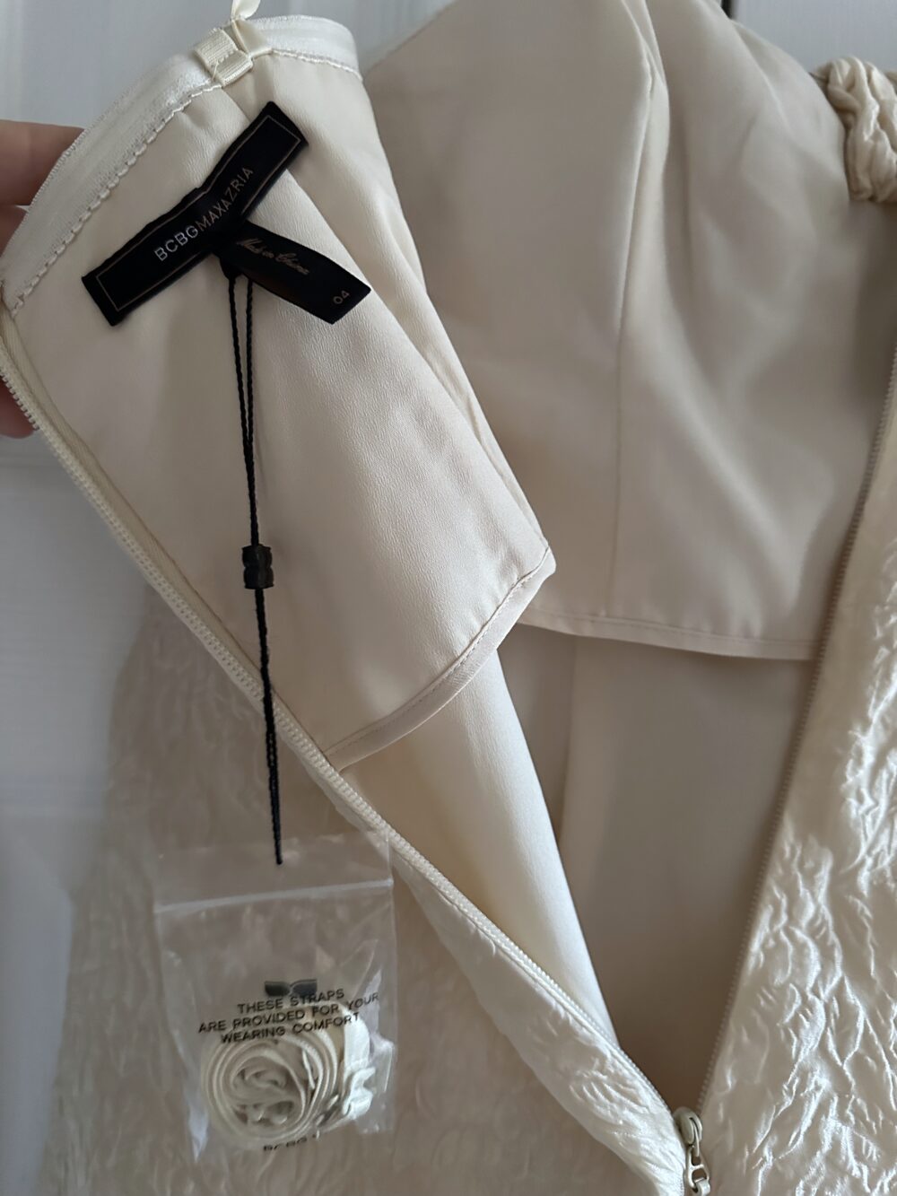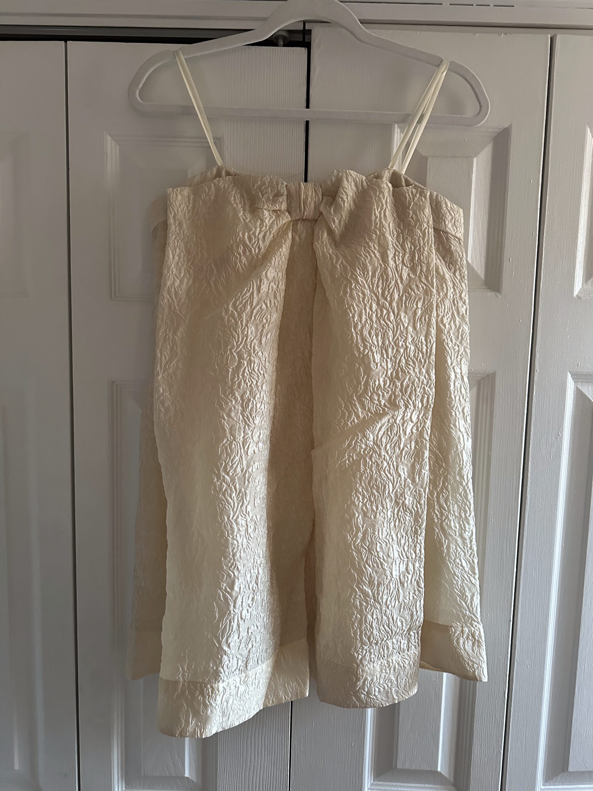 Size 4 but fits me – 36″ bust [34D bra] and lower half doesn’t matter since it’s a-line. Never worn 🙂
